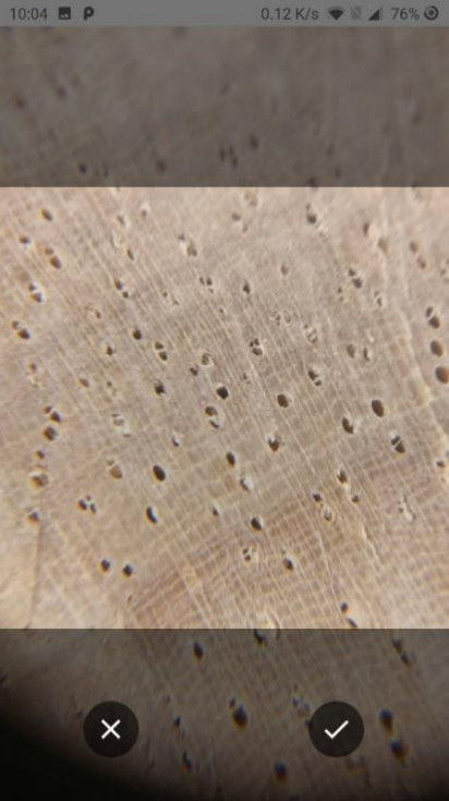 - Using the Xylorix Harvester App, capture 10 images of the freshly cut surface, with varying orientation (rotation). Ensure that the macroscopic features are clear and visible to the human eye (adequate brightness, exposed area with macroscopic features).