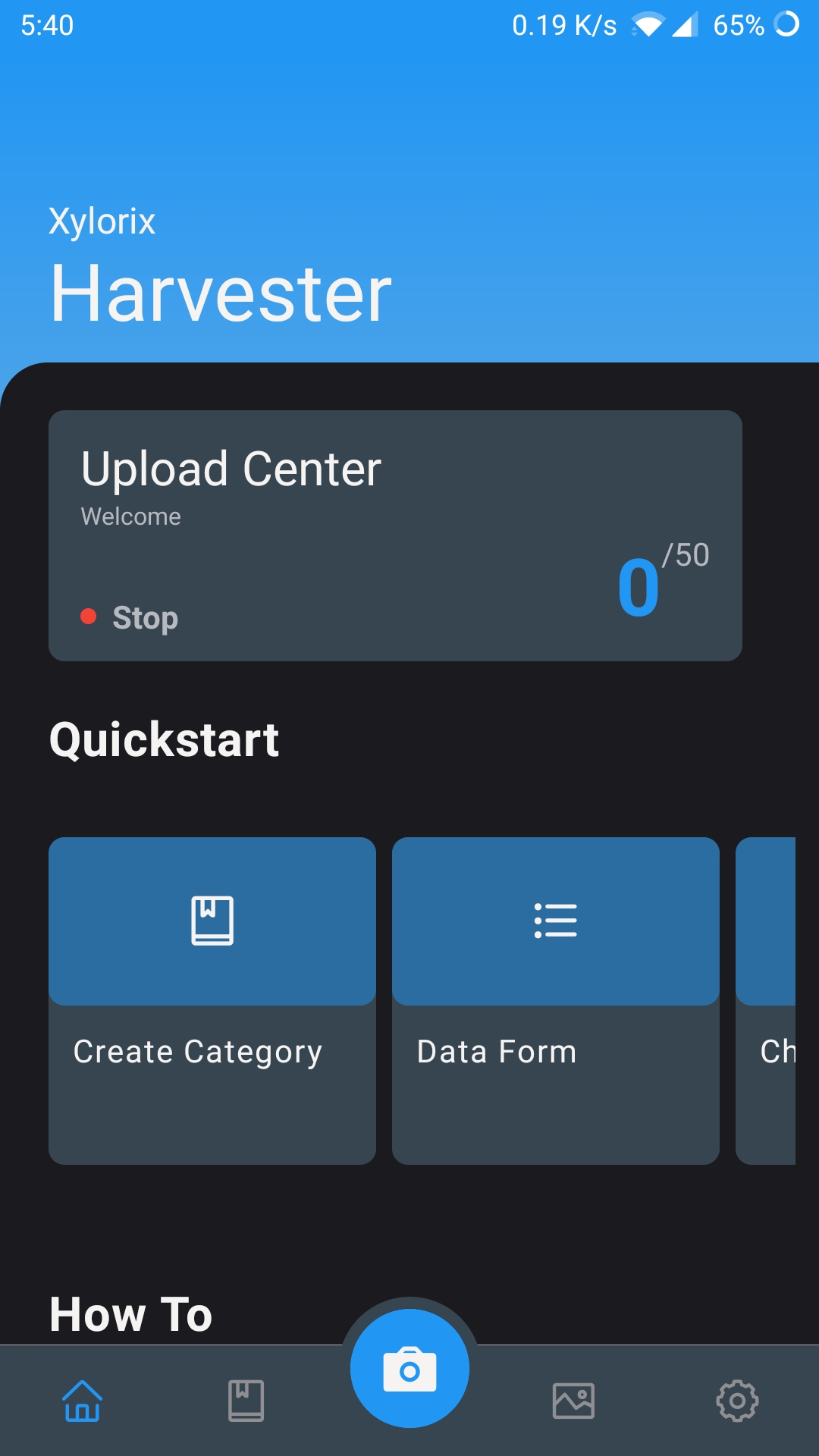 Tap on the "Camera" icon in the center of the bottom bar to go to the Data Collection Page. First: