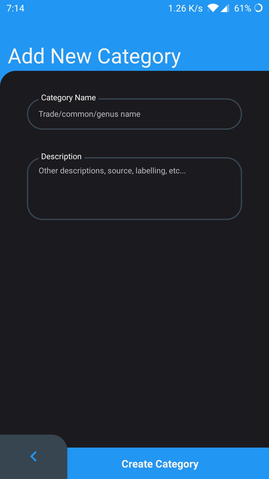 Add a new Category by typing the wood genus name, trade name, or preferred common name for the Category name. Then add any description for the wood category such as owner of wood, labelling, etc. Once done, click "Create Category".