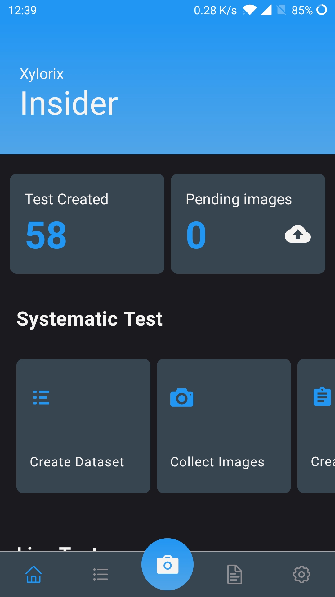 Tap on the Live Test button on the home page to open up the live test camera page. Select the model to be tested and capture the wood image. Tap on the highlighted button to switch capturing mode from 'Single' to 'Multi', which allows the user to capture 3 images of the same wood specimen to get a more accurate and consensus result.