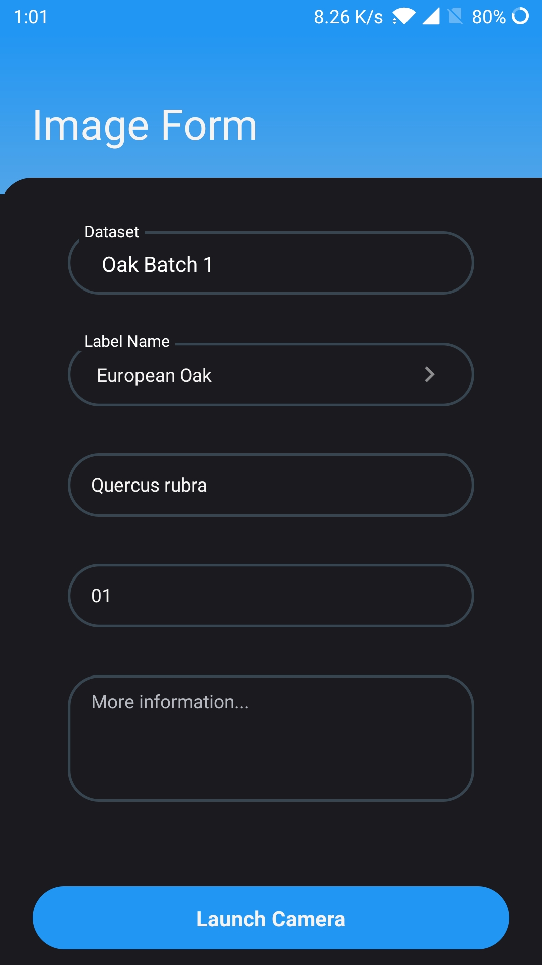 - f) Once all the information is filled in, begin the collection process by tapping the "Launch Camera" button.