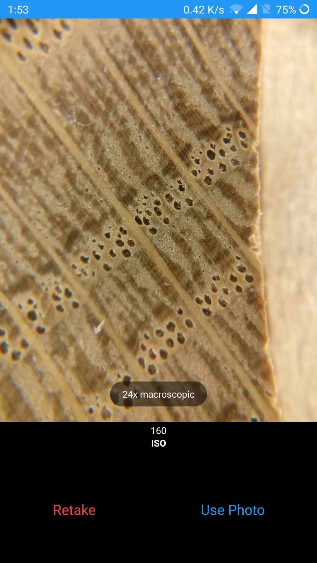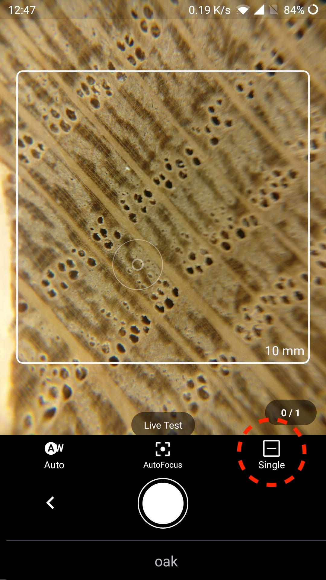 Capture macroscopic images of the wood surface. Make sure the images are clear and sharp in the center of the image as indicated by the highlighted area. Tap the white circle button below to take a picture.