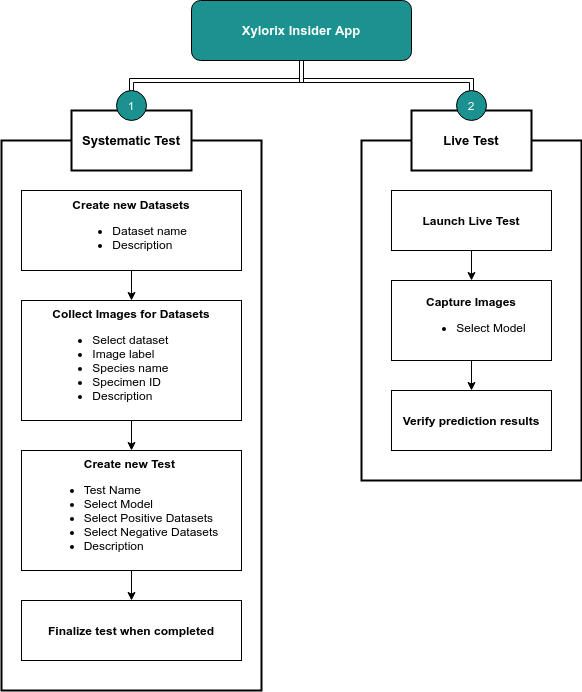 - Systematic Test: Provides users a concise and systematic way to evaluate trained models through images collected and grouped by their respective Datasets. Allows users to create tests for models in which detailed performance reports will be generated and available in the Xylorix Toolkit Webapp.